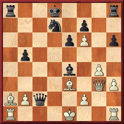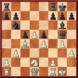 Позиция требовала от Вадима проявления энергичных усилий. Например, 19.f4 , и если 19... ef, то 20.Nf3 Qh6 21.gf , предлагая черным пожертвовать фигуру за две пешки. Увы, тут сказалась известная слабость Вадима – стремление избегать острых позиций. Он сделал вялый ход 19.Kh1 ? . Далее последовала серия не лучших ходов с обеих сторон. Сначала неточно сыграла Вероника: 19... fxg4 (сильнее 19...fe).